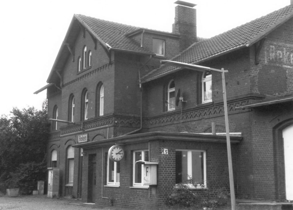 Das um 1900 erbaute Bahnhofsgebäude signalisierte zu jener Zeit auch der ländlichen Bevölkerung die Wende zum industriellen Zeitalter. Mit ihm wurde nämlich auch die Bahntrasse aus dem Ruhegebiet kommend in Richtung Norden realisiert, die im beschaulichen Reken viel Argwohn hervorrief.