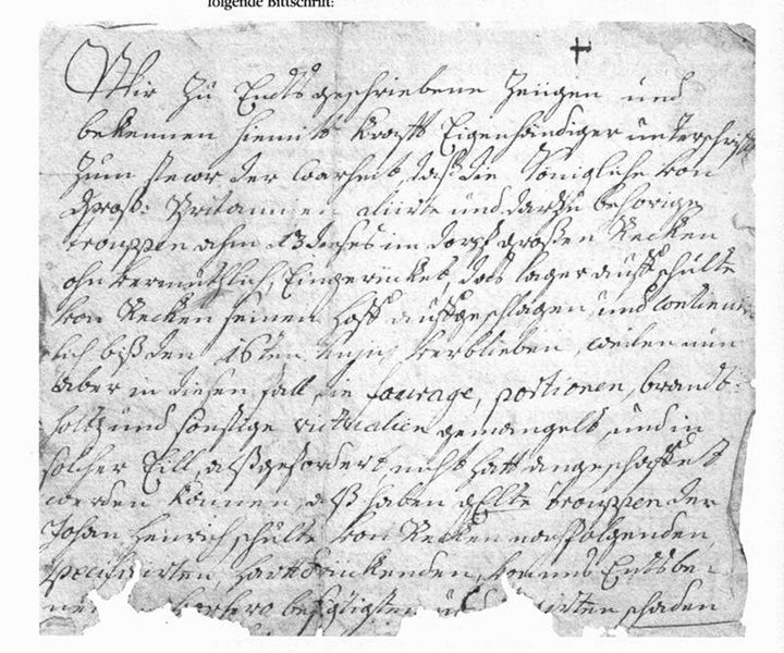 Wörtliche Übersetzung: „Wir zu Ends geschriebenen Zeugen und bekennen hiermit kraffts eigenhändiger Unterschrift zum Decor der Wahrheit; dass die königliche von Groß-Britannien aliirten und dazu gehörigen Truppen ahm 13 dieses im Dorf großen Recken ohn vermuthlich Eingerücket, dass Lager auf Schulte von Reken seinen Hof aufgeschlagen und continuierlich biß den 16 Juli verblieben, weilen nun aber in diesem Fall die Fourage, Portionen, Brandholtz und sonstige Victualien gemangelt in solcher Eile alßgefordert nicht batt angeschaffet werden können haben abgen. Trouppen den Johan Heinrich Schulte von Reken nachfolgenden specifizierten hartdrücken von ` uns Endsbe…( Rückseite) Er in diesen Fall mit sein genutzes Haußgesinn und dennoch in etwa übrig behalten Viehe verschmachten würde geben.“