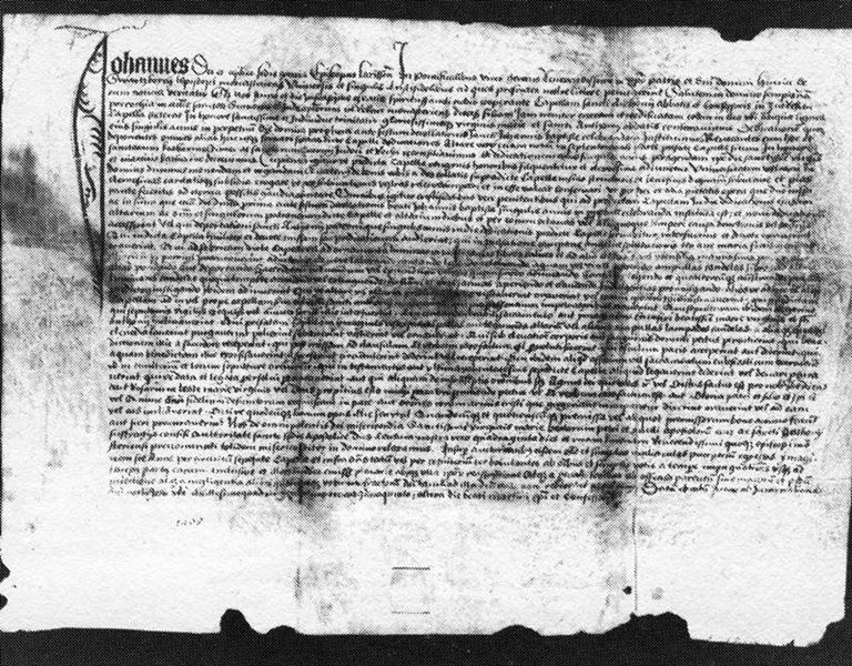 „Wir, Bruder Johannes1, durch Gottes und des Apostolischen Stuhles2 Gnade Bischof von Natura3 und Generalvikar4 des Bischofs Heinrich von Münster erklären durch die vorliegende Urkunde, dass wir im Jahre des Herrn 1447, am Tage nach dem Fest der Apostel Philıppus und Jakobus, diese Kapelle und ihren Altar zu Ehren des Heiligen Kreuzes, der Seligen Jungfrau Maria, des hl. Antonius5 und des Theobaldus konsekriert6 haben. Wir bezeugen dies durch Anhängung unseres Siegels und durch die Existenz dieser Urkunde, gefertigt zum oben genannten Datum.