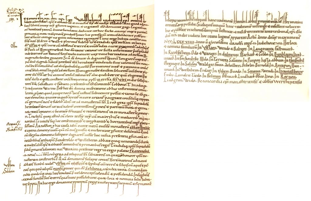 Verhandelt im Jahre der Menschwerdung unseres Herrn DCCCLXXXVIIII (889) im zweiten Jahre der Regierung unseres glorreichen König Arnulf, im Jahre 7 der Indikation.