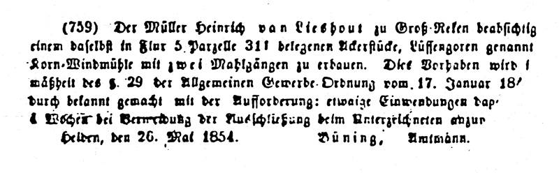 Im Jahre 1854 stellte Heinrich Lieshout den Antrag, eine Mühle zu errichten. Der Antrag wurde veröffentlicht Öffentlicher Anzeiger Nro 22 Beilage zum Amtsblatt der Königlichen Regierung zu Münster vom 3. Juni 1854