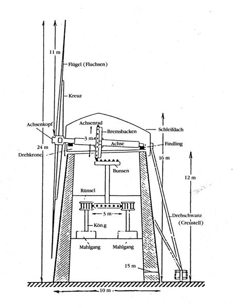 I0 tens Die obere Hauptachse der Mühle ist noch neu II tens Der Kran nebst Haken zum aufziehen der Steine noch neu